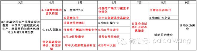 承接上一步骤,我们了解了目标流量入口的时间节点和流量,这个时候我们可以根据时间节点来安排整店的营销计划即推广节点和安排节点,可以根据计划的事项安排以及官方活动时间点来安排计划事项,如: