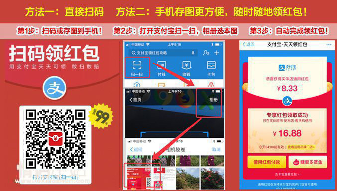 (1)扫码领红包,天天可领!(可以领通用红包、余额宝大额红包、到店红包、消费鼓励金等等。余额宝红包,多的每天领上10几个大洋,少则也是三五元)