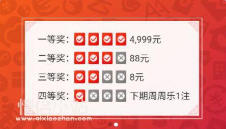 3)每一期开奖时,每一注周周乐只有一次中奖机会,按最大奖项计算(如:中了一等奖,不再复算中了二、三、四等奖)